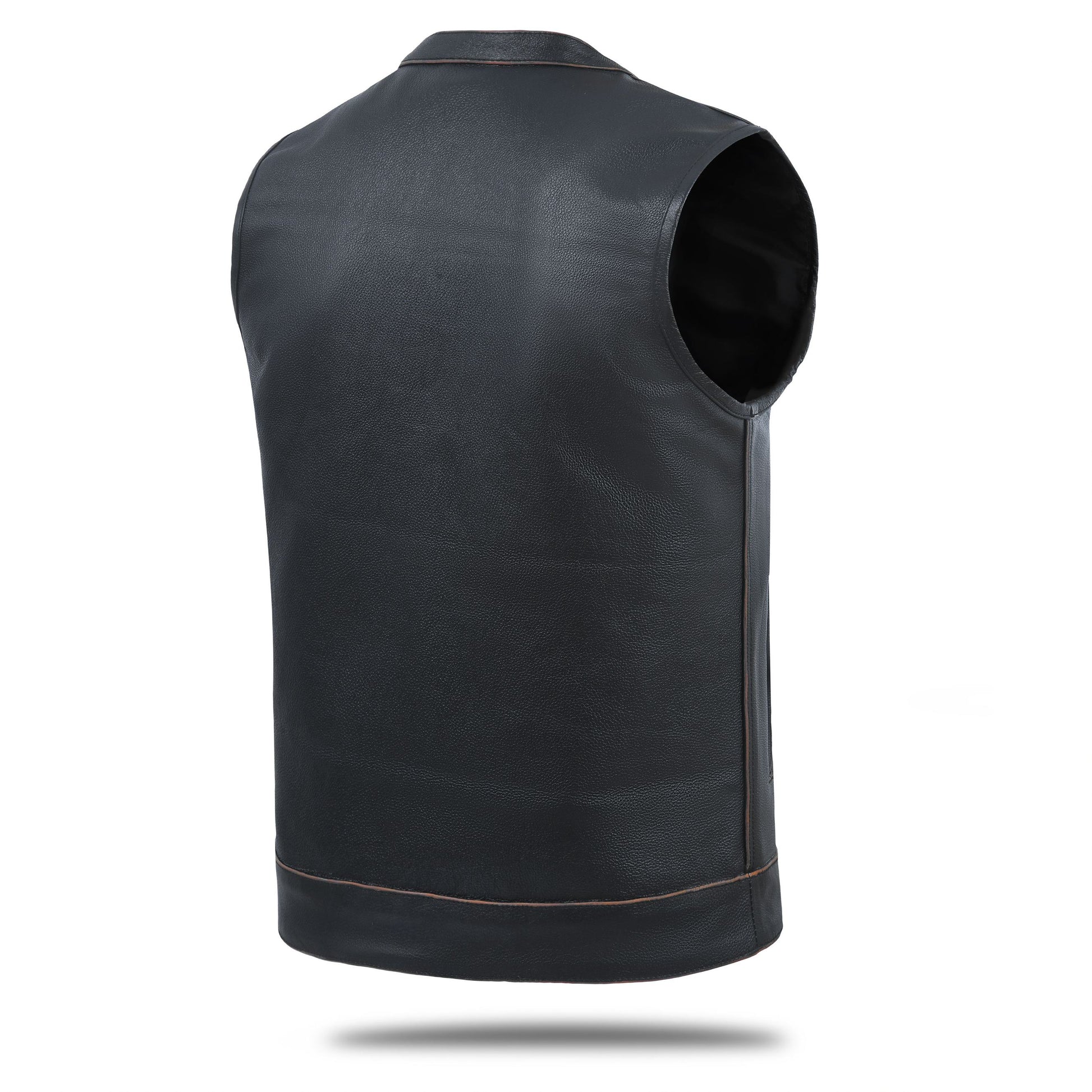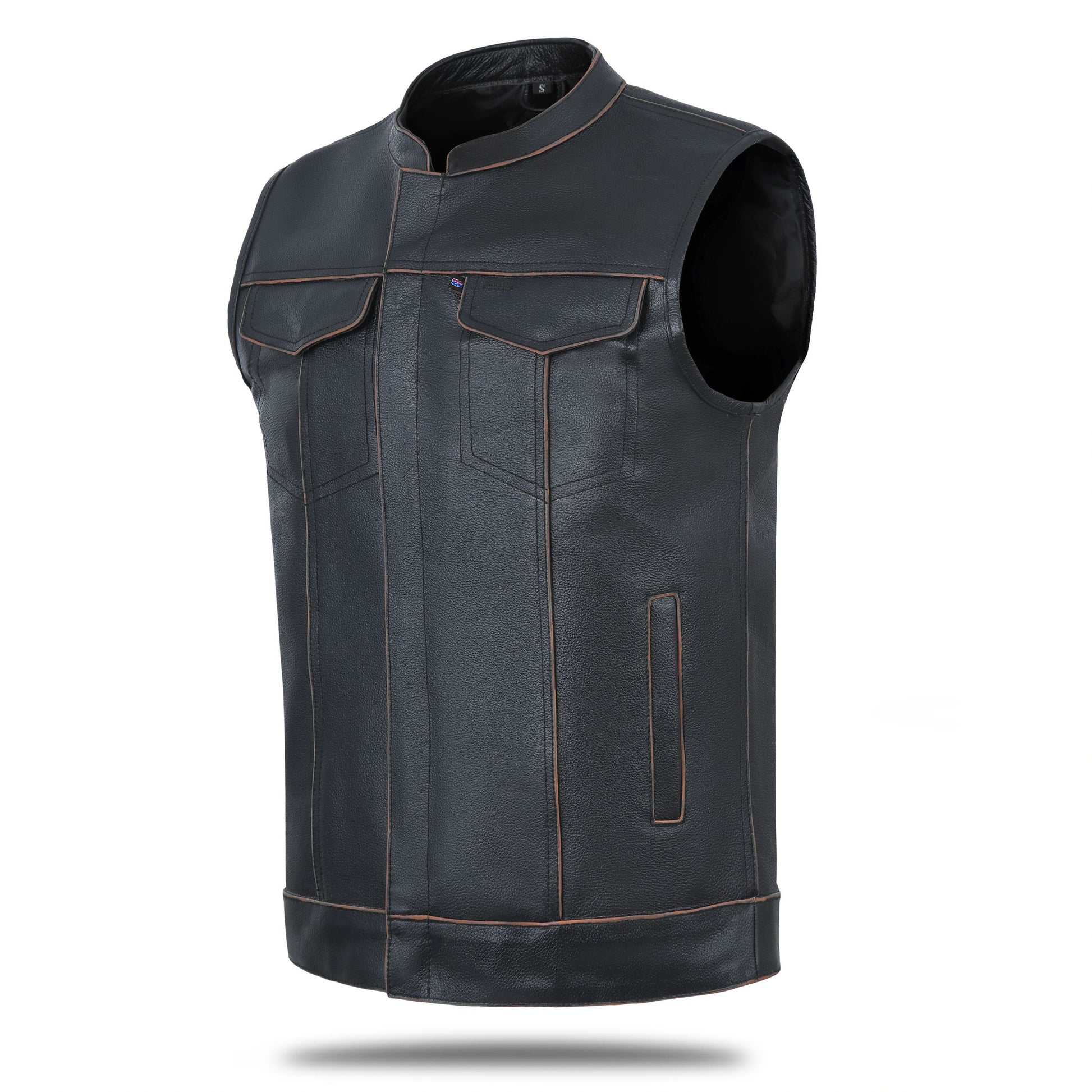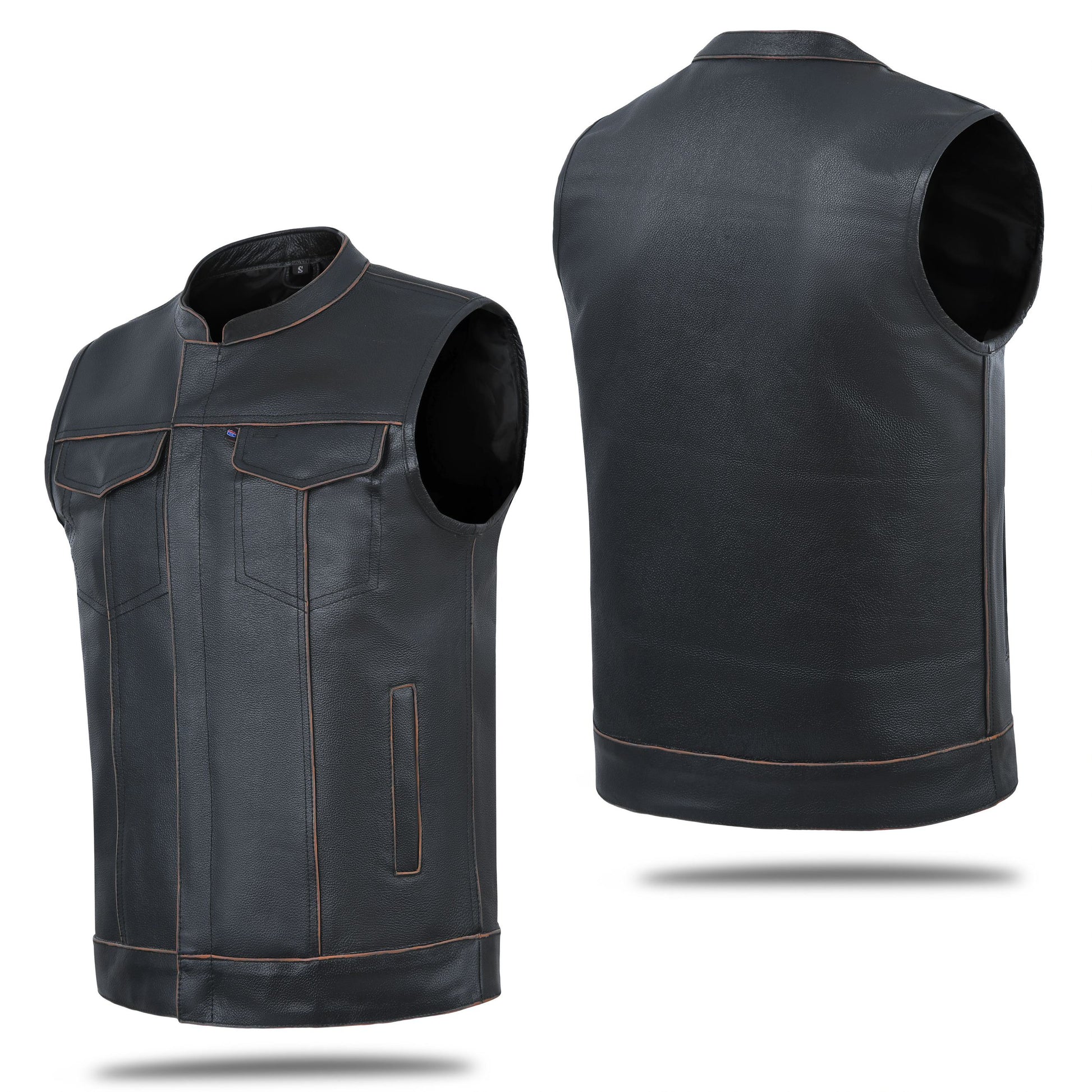 Zipper & Snap closure Brotherhood Leather Vest is one of our finest Vests offered. It is the best fitting Outlaw style Vest in the marketplace. It is inspired by classic denim motorcycle vests, as well as the SAMCRO Club Vest worn on the hit series "Sons of Anarchy" on FX Networks. We use a heavier, finer grade cowhide leather and the main snaps are hidden on the front panel & chest pockets. It features two custom designed interior gun pockets large enough for a full size Colt .45 ACP.