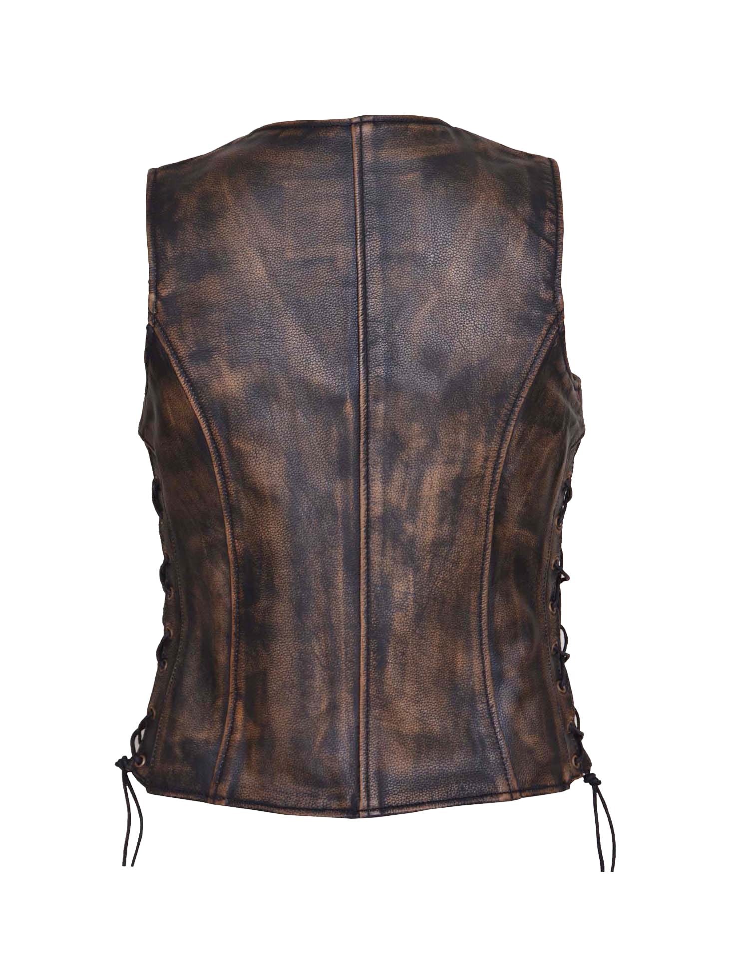 - Ladies Nevada Brown Ultra Leather Motorcycle Zippered Vest in drum dyed naked cowhide
