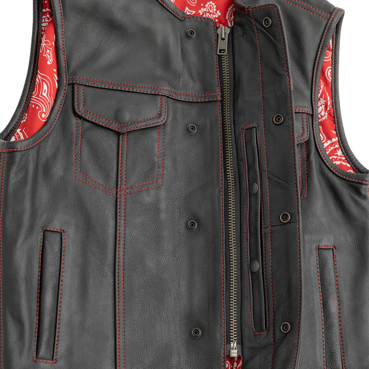 Zipper & Snap closure Brotherhood Leather Vest is one of our finest Vests offered. It is the best fitting Outlaw style Vest in the marketplace. It is inspired by classic denim motorcycle vests, as well as the SAMCRO Club Vest worn on the hit series "Sons of Anarchy" on FX Networks. We use a heavier, finer grade cowhide leather and the main snaps are hidden on the front panel & chest pockets. It features two custom designed interior gun pockets large enough for a full size Colt .45 ACP.
