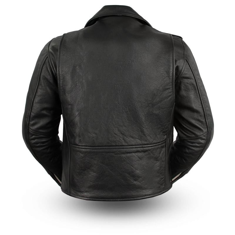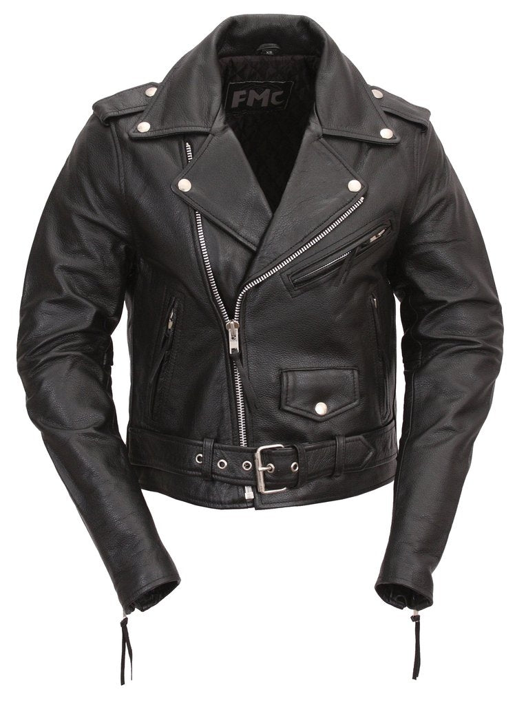 Motorcycle Leather Jacket, FMC Bikerlicious, Women's Classic M-C Jacket. Soft Drum Dyed Leather. Silver Hardware. 2 outside zippered pockets. 2 inside pockets. Action back. Half belt. Quilted lining. Sizes: XS, Thu 5X Color: Black