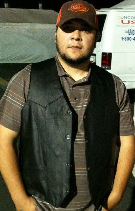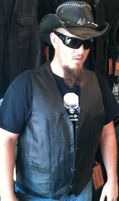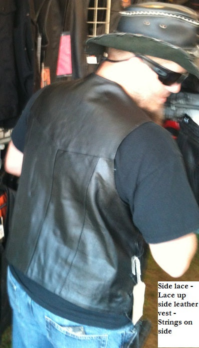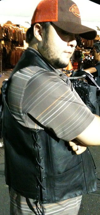 Our Classic Side-Laced leather Motorcycle Vest is made of 2 oz buffalo hide and has a smooth sewn-in lining. Two external and two internal pockets make it convenient to carry the few essential items you’ll need. This motorcycle vest has four black steel snaps. Workmanship on our quality motorcycle vests is GUARANTEED!