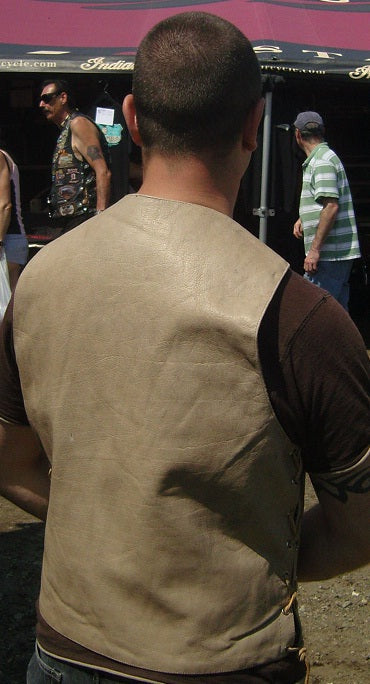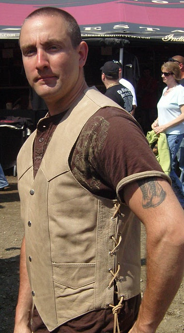 Our brown side lace Motorcycle Vest is made of 2 oz Buffalo hide and has a smooth sewn-in lining. Two external and two internal pockets make it convenient to carry the few essential items you’ll need. This motorcycle vest has four steel snaps. Workmanship on our quality motorcycle vests is GUARANTEED! – and we guarantee your satisfaction!