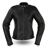 This Biker jacket is made with black fashion grade naked sheep skin leather with a stand up collar & single snap shoulder epaulette. Quilted panel detail on each shoulder. Lowered zippered pockets with nail head details & zipper on each sleeve. Two inner pockets & quilted kidney belt detail. Full sleeve zip out liner.