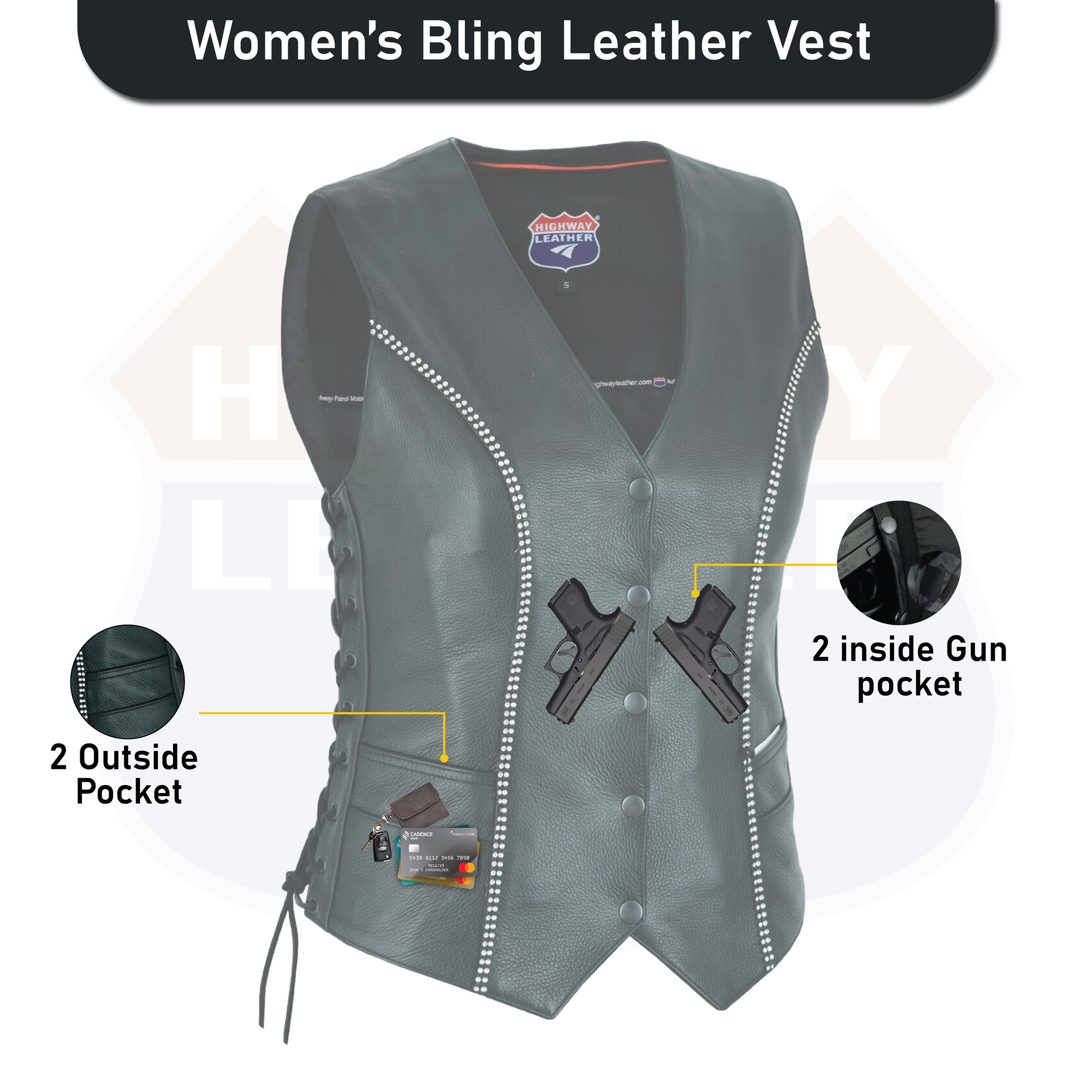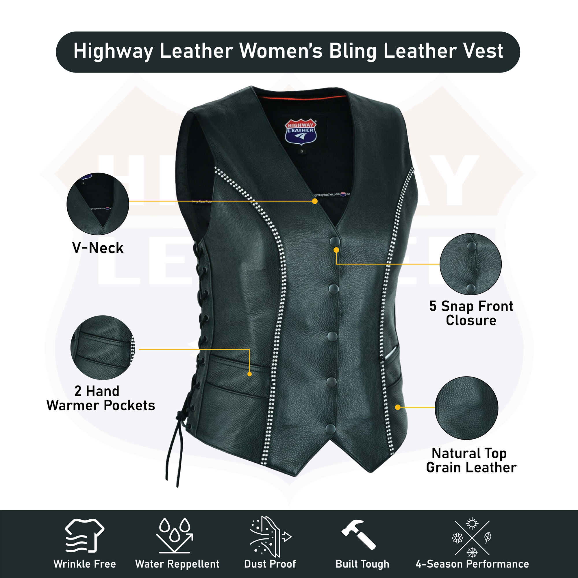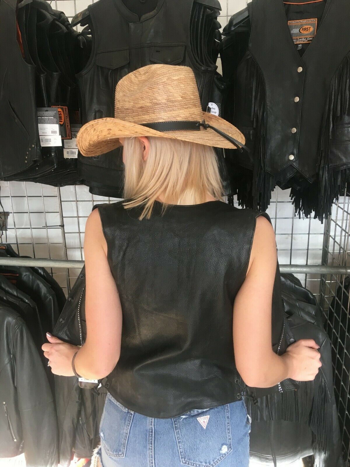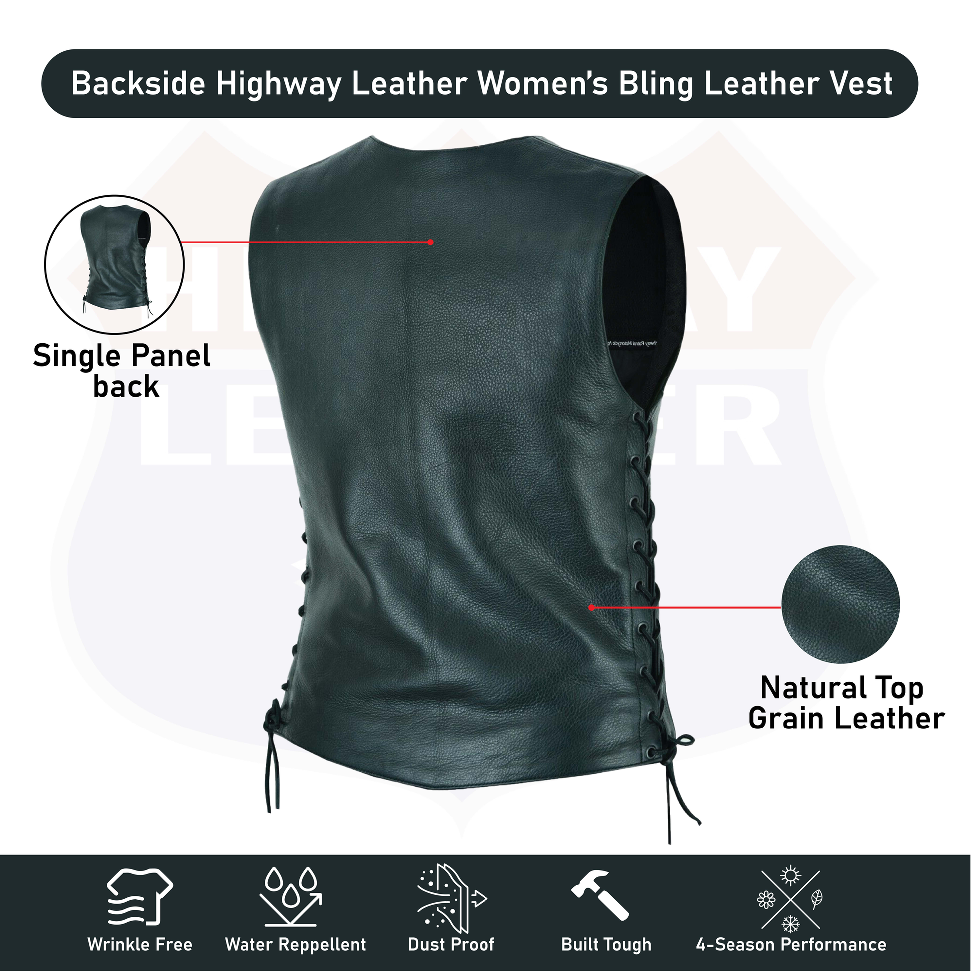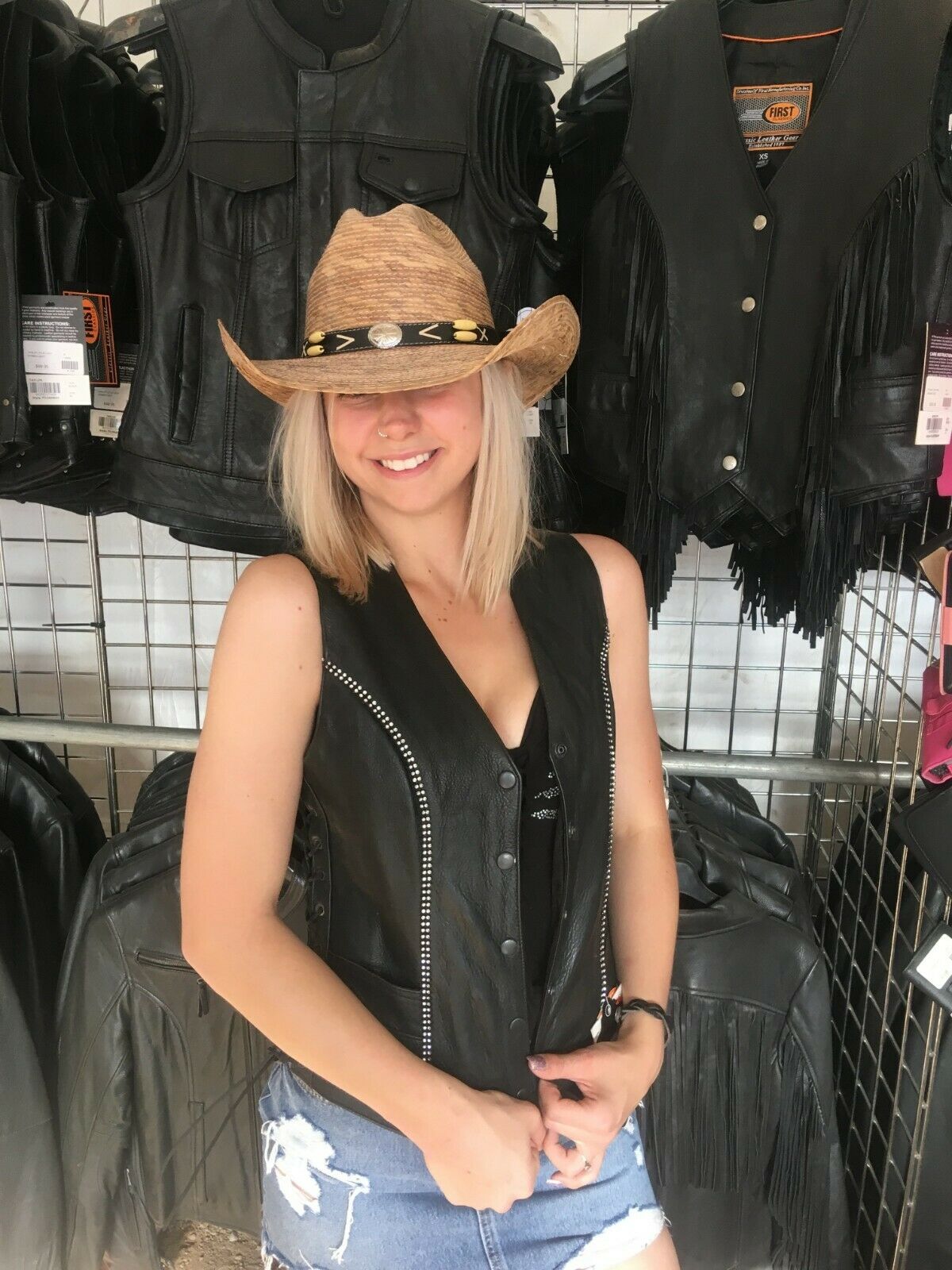 Ride with confidence and sparkle in the Rhinestone Bling Buffalo Leather Vest—a perfect combination of Harley-Davidson biker toughness and feminine style.