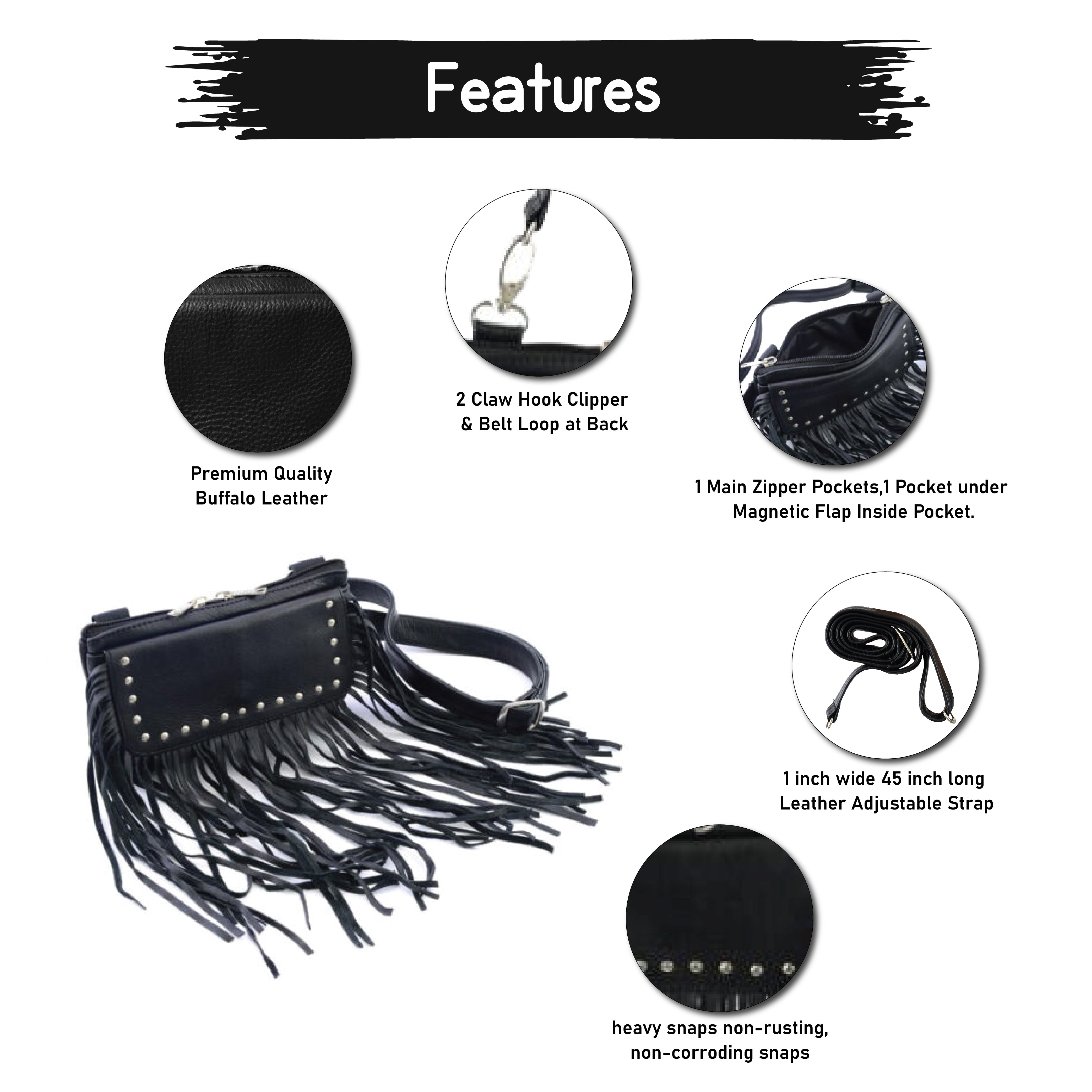 • Studded + Fringe Design for a bold, rebellious Harley-inspired look.