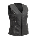 Front Zipper Side Lace vest is crafted from Medium weight Cowhide leather in a flattering cut for a feminine figure. From the v-neck, to the seams with small circular studs on front and back, this vest is eye-catching with simple details and a great fit. It's satin lined to keep you cool and comfortable. And pockets! With two slash pockets on the exterior and two conceal pockets inside.