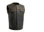 The Hornet is a unique version of our standard club vest - featuring the beehive style stitching on the shoulders. This vest has a roll up collar, covered snaps, and cropped center zipper along with all of our FMCo pockets.